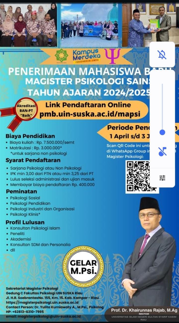 Pekanbaru, 4 Juni 2024 – Fakultas Psikologi UIN Sultan Syarif Kasim Riau (UIN Suska Riau) dengan bangga mengumumkan Penerimaan Mahasiswa Program Magister Psikologi untuk tahun akademik 2024. Program ini merupakan kegiatan tahunan setelah Program Magister ini diresmikan pada tahun 2018. Menurut Dekan Fakultas Psikologi, Dr. H. Kusnadi, M.Pd, bahwa program ini diharapkan dapat menghasilkan lulusan...Read More