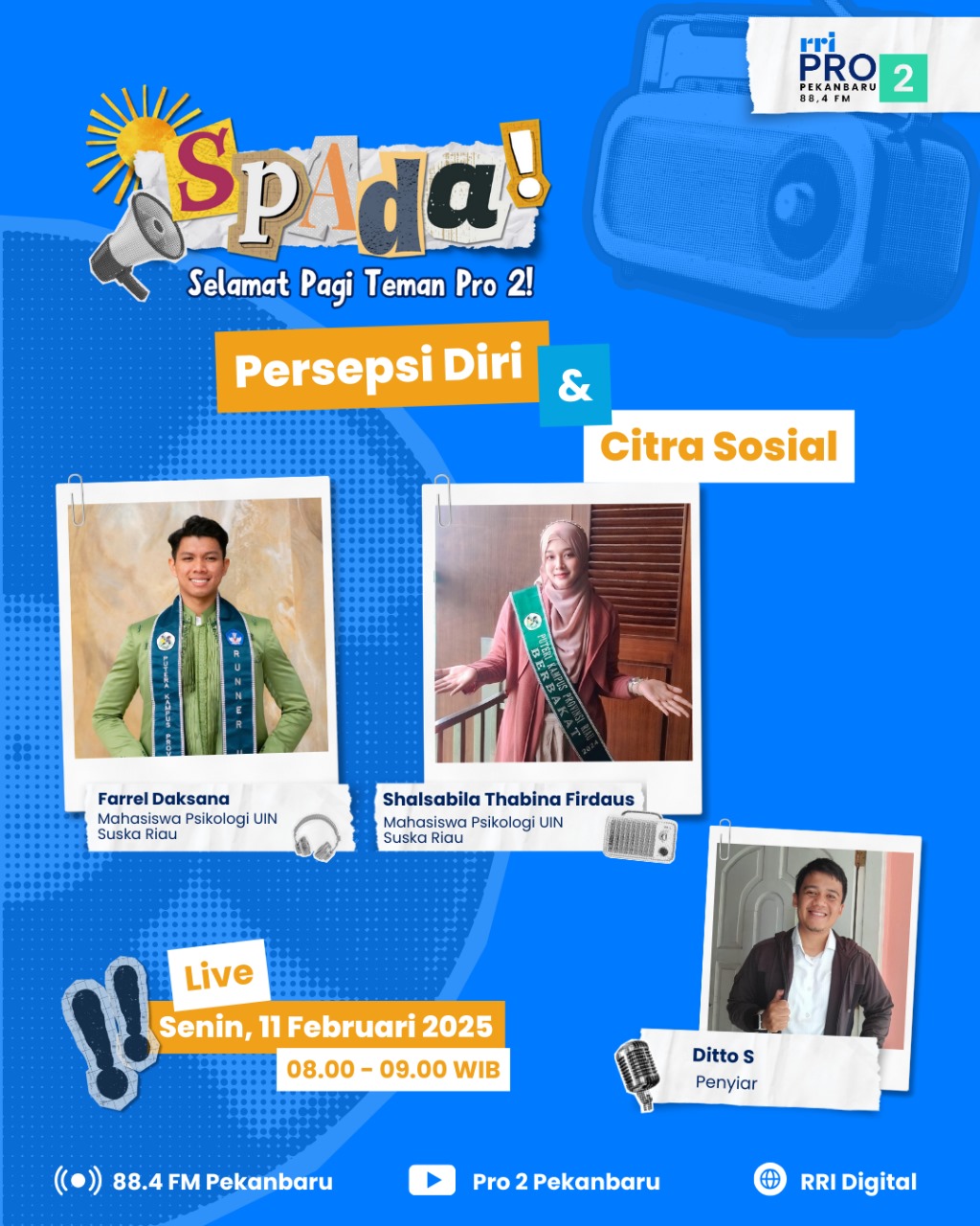 Pekanbaru, 11/02/25. Program SPADA ( Selamat Pagi Pro 2 ) kembali menyiarkan siaran langsung di Chanel Youtube Pro 2 FM Pekanbaru pada hari Selasa, 11 Februaru 2025 , kali ini yang menjadi narasumber dari Fakultas Psikologi adalah Farrel Daksana semester 2 peraih Runner up 3 pemilihan Putra Kampus Riau 2025 dan Shalsabila Thabina Firdaus semester 4 dan juga merupakan Putri Kampus Riau Berbakat 2024 yang merupakan mahasiswa Fakultas Psikologi UIN Suska Riau. Adapun topik yang didiskusikan adalah “Persepsi Diri Dan Citra Sosial”.
