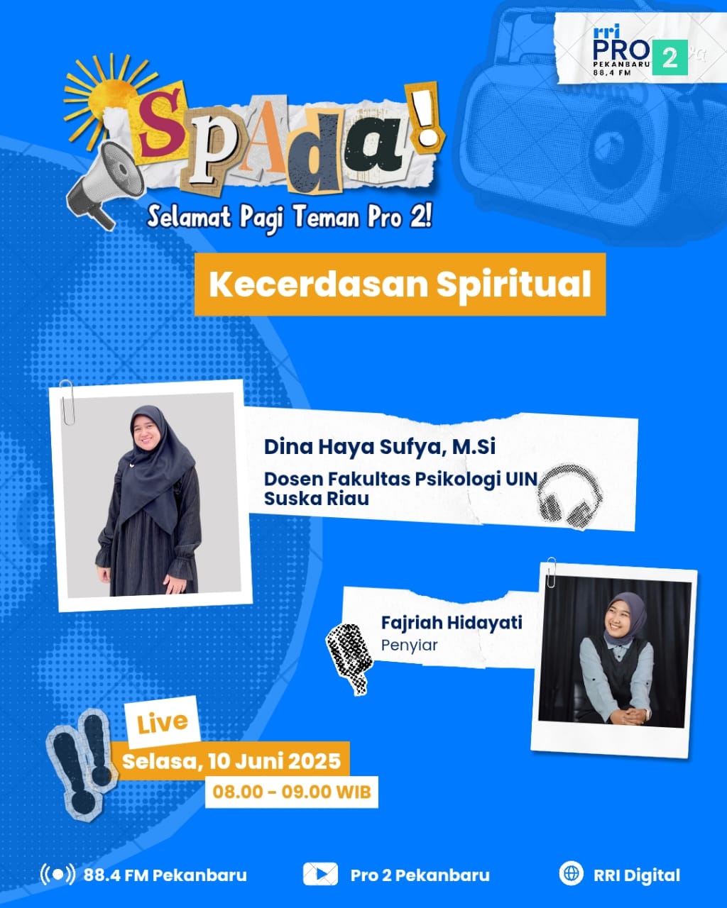 Pekanbaru,10/05/25. Selamat Pagi Teman Pro 2 (SPADA) kembali menyiarkan secara live melalui Channel Youtube Pro 2 Pekanbaru. Dina Haya Sufya,M.Si dosen Fakultas Psikologi UIN Suska Riau menjadi narasumber hari ini dengan topik: “Kecerdasan Spiritual”. Sedangkan sebagai pemandu diskusi oleh Fajriah Hidayati dari RRI Pro 2 Pekanbaru