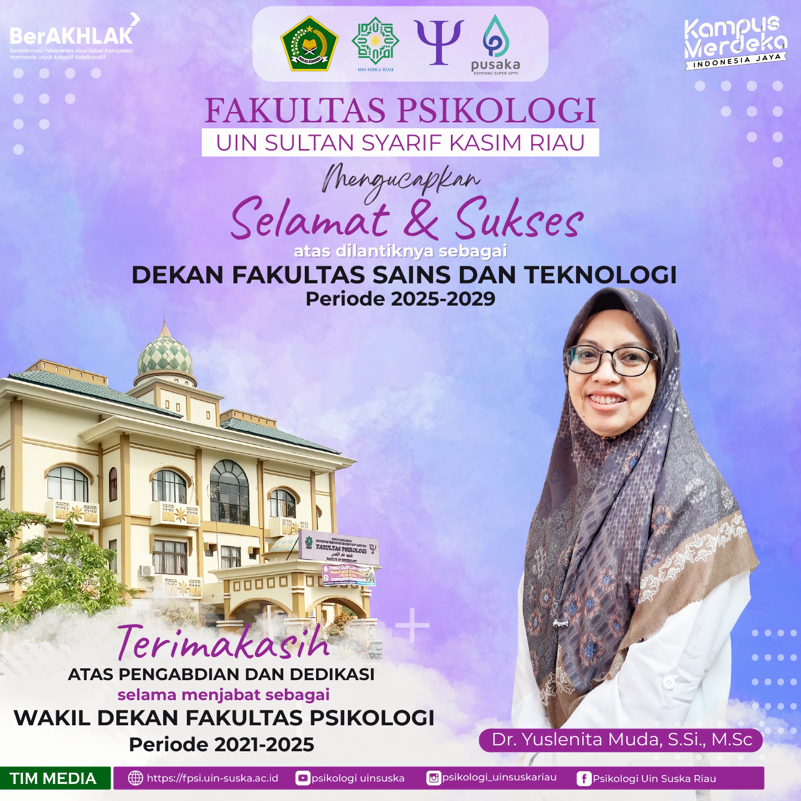 Pekanbaru,11/07/25. Keluarga besar Fakultas Psikologi mengucapkan selamat menjalankan tugas ditempat yang baru dan sukses atas dilantiknya DR.Yuslenita Muda sebagai Dekan Fakultas Sains dan Teknologi UIN Suska Riau. Pelantikan itu langsung dilakukan oleh Rektor Prof.DR.Hj.Leny Novianti,MS.,SE.,M.Si.,AK pada hari Rabu, 02 Juli 2025 di Gedung Rektorat Lt v UIN Suska Riau.