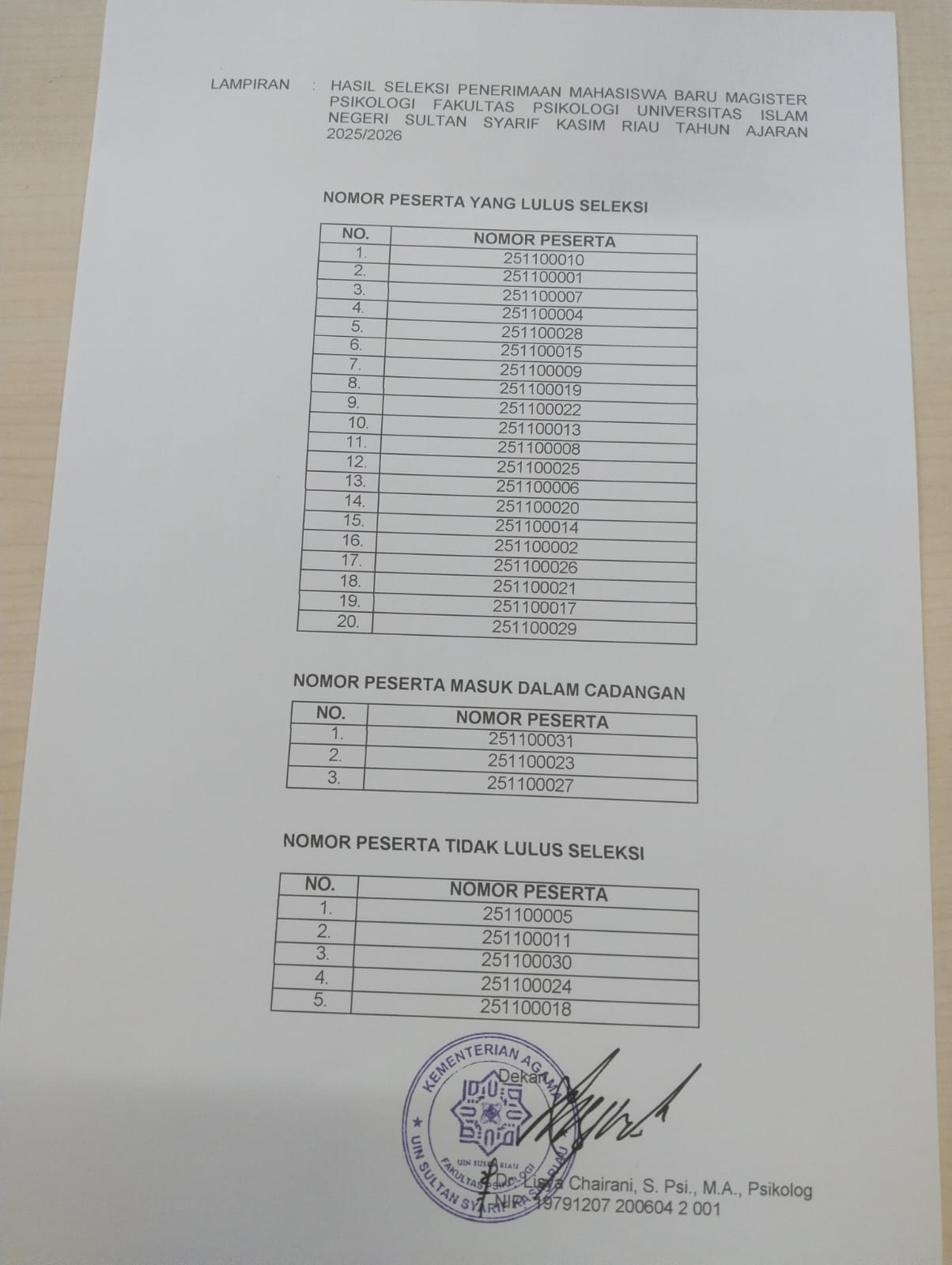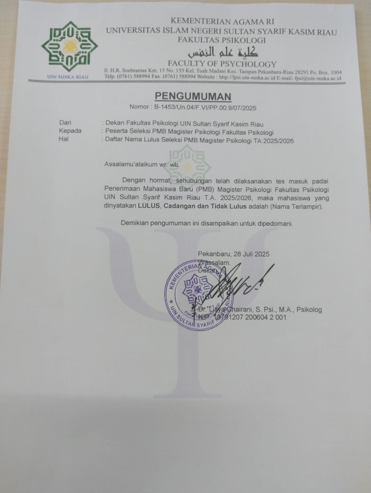 Setelah melalui proses seleksi ketat yang mencakup ujian tertulis dan wawancara pada 23 Juli 2025 lalu, Program Studi Magister Psikologi Fakultas Psikologi UIN Suska Riau secara resmi mengumumkan hasil kelulusan calon mahasiswa baru tahun akademik 2025/2026.