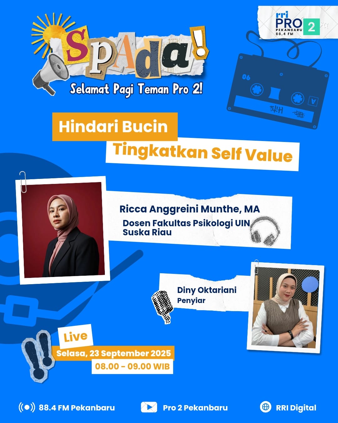 Pekanbaru, 24/09/25. Ricca Anggreini Munthe, MA dosen Fakultas Psikologi UIN Suska Riau menjadi Narasumber dalam diskusi yang disiarkan secara langsung di Channel Youtube Pro 2 RRI Pekanbaru SPADA ( Selamat Pagi Teman Pro 2 Pekanbaru) dengan Tema “Hindari Bucin, Tingkatkan Self – Value” dengan dipandu oleh Diny dari RRI Pro 2 Pekanbaru, pada Hari Selasa 23 September 2025.