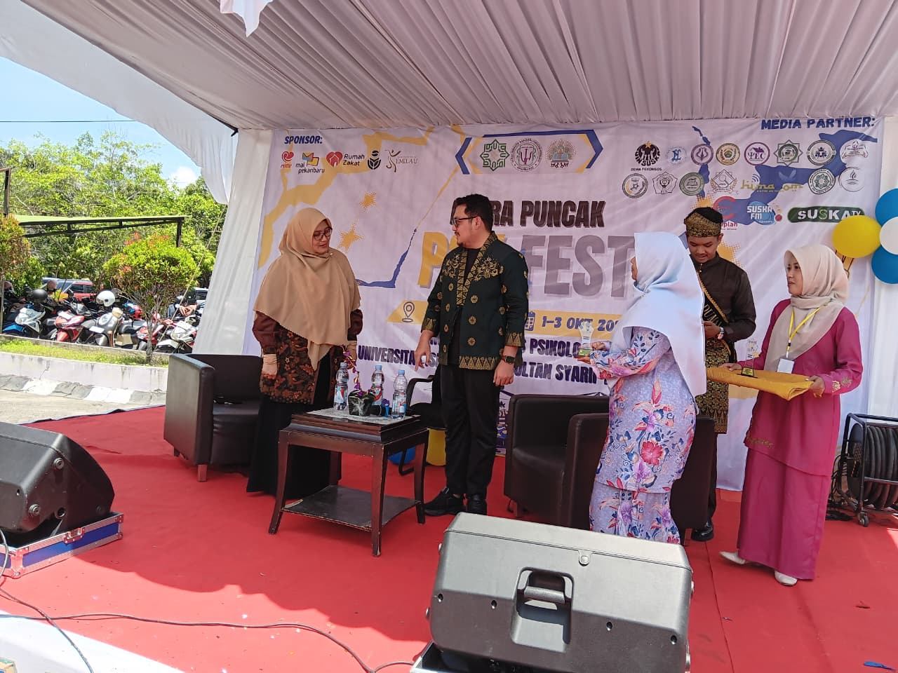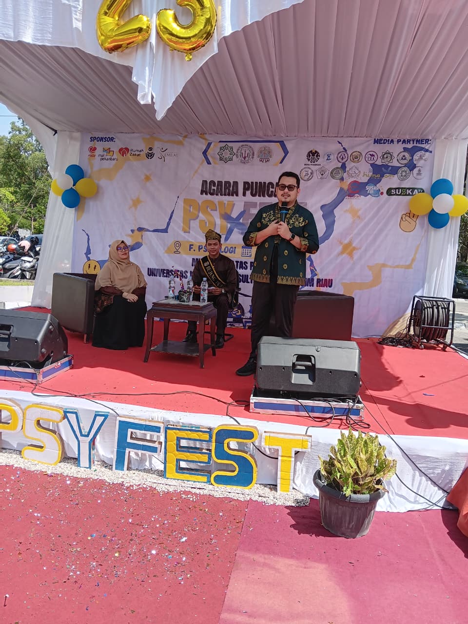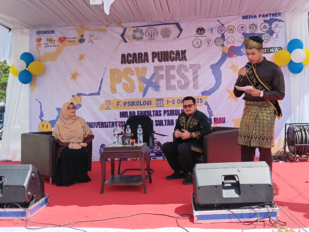 Pekanbaru, 06/10/25. Bersempena Milad Ke – 23 Fakultas Psikologi UIN Suska Riau, panitia menghadirkan narasumber Dt Seri Rizky Bagus Oka, S.M, Anggota DPRD Pekanbaru dan Ketua Kadin Pekanbaru dan Dekan Fakultas Psikologi UIN Suska Riau Dr.Lisya Chairani, MA.,Psikolog yang dibungkus dengan acara Talkshow dengan Tema, “Psikologi Kewirausahaan; Menumbuhkan Mental Tangguh Bagi Pelaku UMKM”. Dipandu oleh Farell Daksana Mahasiswa Fakultas Psikologi. Pada Hari, Jumát 03 Oktober 2025 di halaman Parkir Fakultas Psikologi.