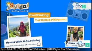 Pekanbaru, 14/10/25. Menjadi Narasumber Elyusra Ulfah, M.Psi., Psikolog dosen Fakultas Psikologi UIN Suska Riau, menilai overthinking dalam kajian psikologi merupakan kajian yang menarik untuk didiskusikan dan diteliti karena overthinking bukan hanya berdampak pada psikologis individu tetapi juga dapat berbahaya bagi tubuh manusia. Hal itu salah satu sisi lain yang didiskusikan dalam acara SPADA ( Selamat Pagi Teman Pro 2 Pekanbaru ) yang disiarkan secara langsung dari Studio RRI Pro 2 Pekanbaru. Pada Hari, selasa 14 Oktober 2025 dengan Tema “ Overthinking : Yuk Kelola Pikiranmu”. Dipandu oleh Khana’ Lathifah dari RRI Pro 2 Pekanbaru.