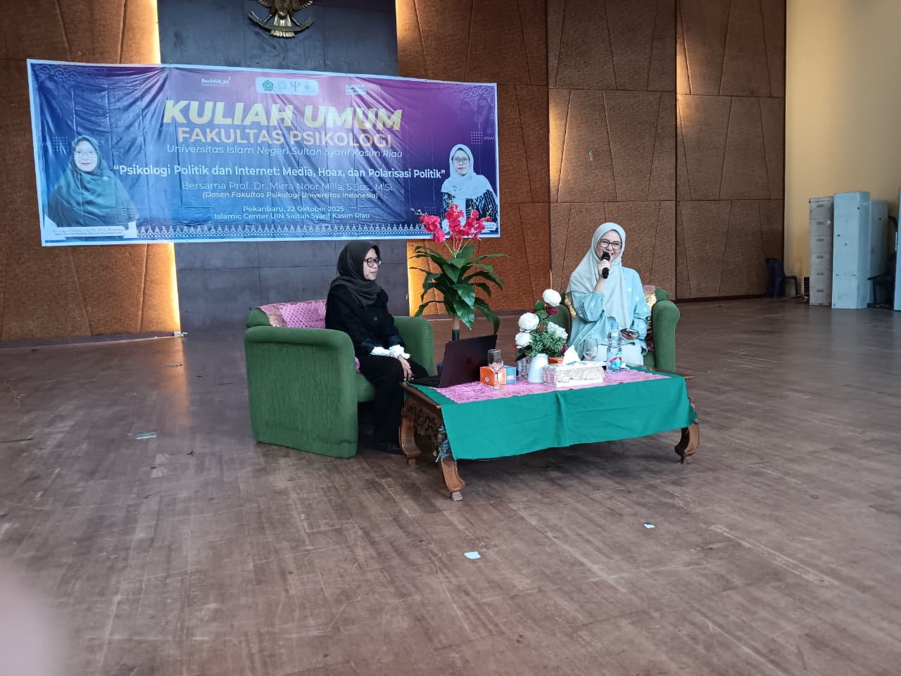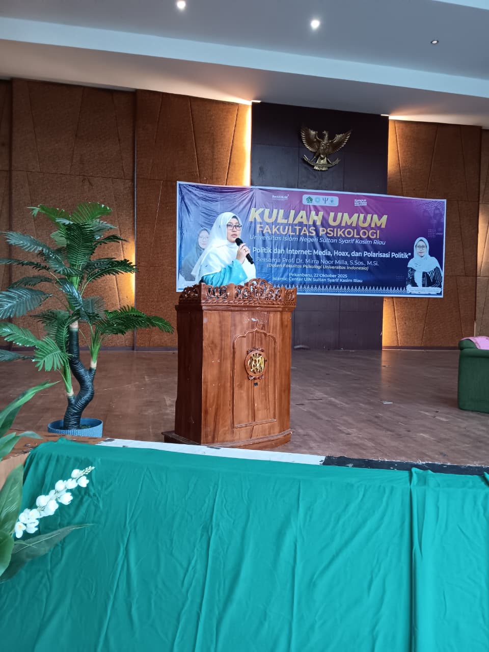 Pekanbaru, 22/10/25. Fakultas Psikologi UIN Suska Riau sukses gelar Kuliah Umum Tahun Anggaran 2025 , kegiatan ini diselenggarakan pada hari Rabu, 22 Oktober 2025 di Gedung Islamic Center ( IC ) UIN Suska Riau. Panitia menghadirkan pembicara tunggal yaitu Prof. Dr. Mirra Noor Milla, S.Sos., M.Si Dosen Fakultas Psikologi Universitas Indonesia ( UI ) Jakarta dengan Judul, “Psikologi Politik Dan Internet : Media, Hoax Dan Polarisasi Politik “.
