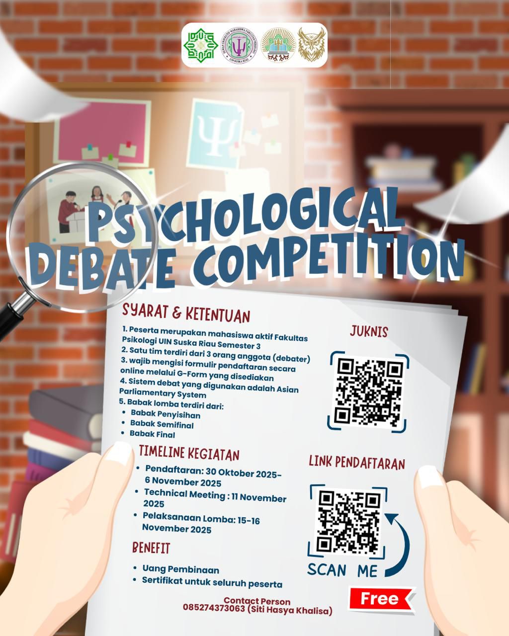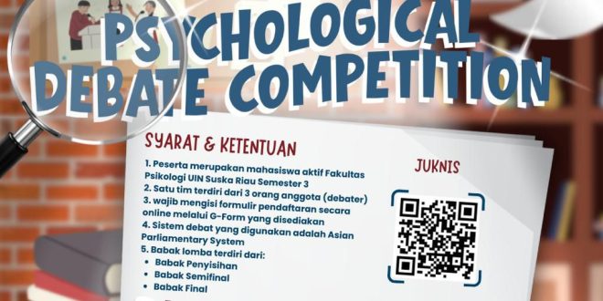 Pekanbaru, 04/11/25. DEMA F-Psikologi telah membuka pendaftaran “Psychological Debate Competition”, Perlombaan ini ditujukan bagi Mahasiswa UIN Suska Riau Fakultas Psikologi Semester 3! Dengan mengusung tema “Peduli Kesehatan Mental: Antara Kesadaran Nyata atau Trend Sementara”.