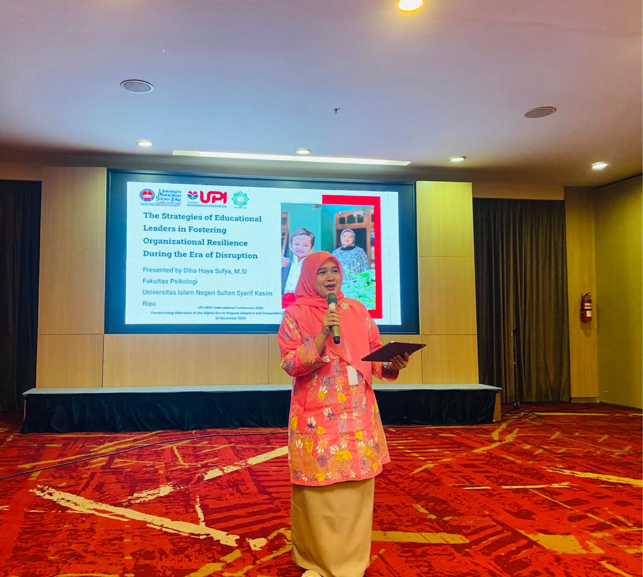Pekanbaru, 04/12/25. Dua dosen Fakultas Psikologi Universitas Islam Negeri Sultan Syarif Kasim (UIN Suska) Riau telah berpartisipasi aktif dalam ajang akademik bergengsi, *UPI-UPSI International Conference 2025*. Konferensi yang mengusung tema besar “Transforming Education in the Digital Era to Prepare Adaptive and Competitive Global Citizens” ini diselenggarakan secara luring di Hotel Grand Tjokro, Bandung, pada 19-21 November 2025. Kedua dosen itu adalah Yuli Widiningsih, M.Psi., Psikolog dan Dina Haya Sufya, M.Si