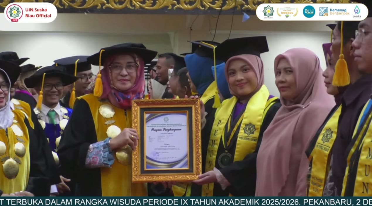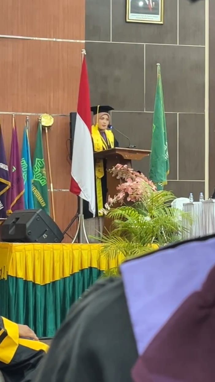 Pekanbaru, 11/12/25. Raiqah Salsabila, Pemuncak Fakultas Psikologi pada Wisuda Periode IX Tahun 2025 UIN Sultan Syarif Kasim Riau, terpilih berpidato untuk memberikan sambutan atau kesan pesan sebagai perwakilan wisudawan/wisudawati pada hari Selasa, 02 Desember 2025 di Gedung Pusat Kegiatan Mahasiswa (PKM). Raiqah Salsabila lulus dengan Indeks Prestasi Kumulatif 3,83 dan mendapatkan predikat Cum Laude.