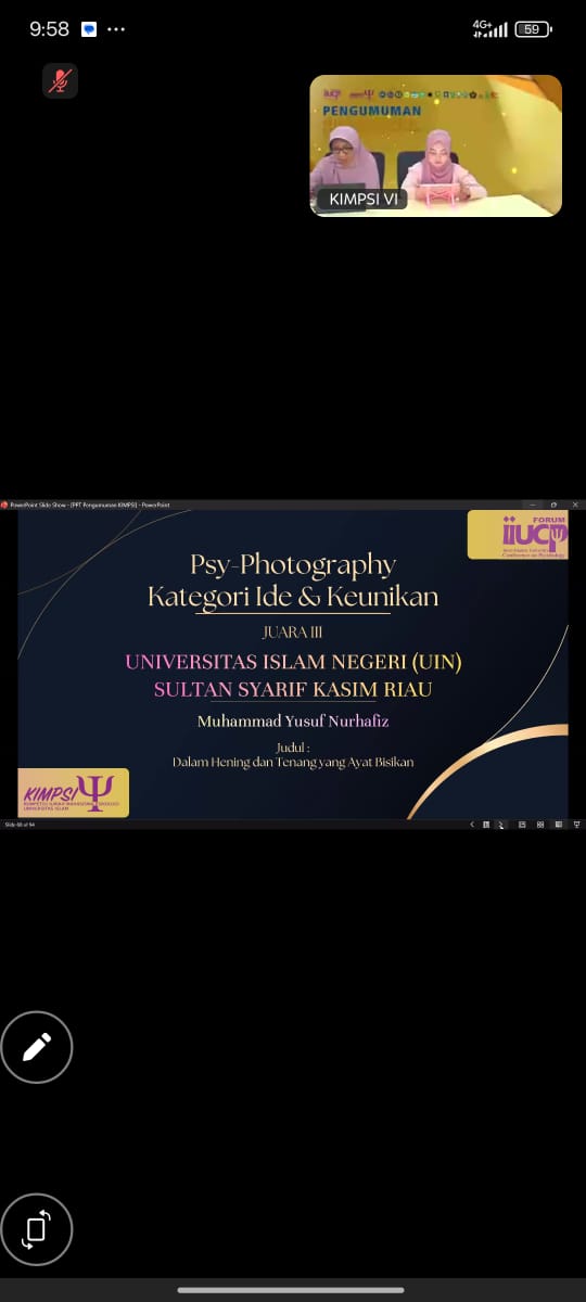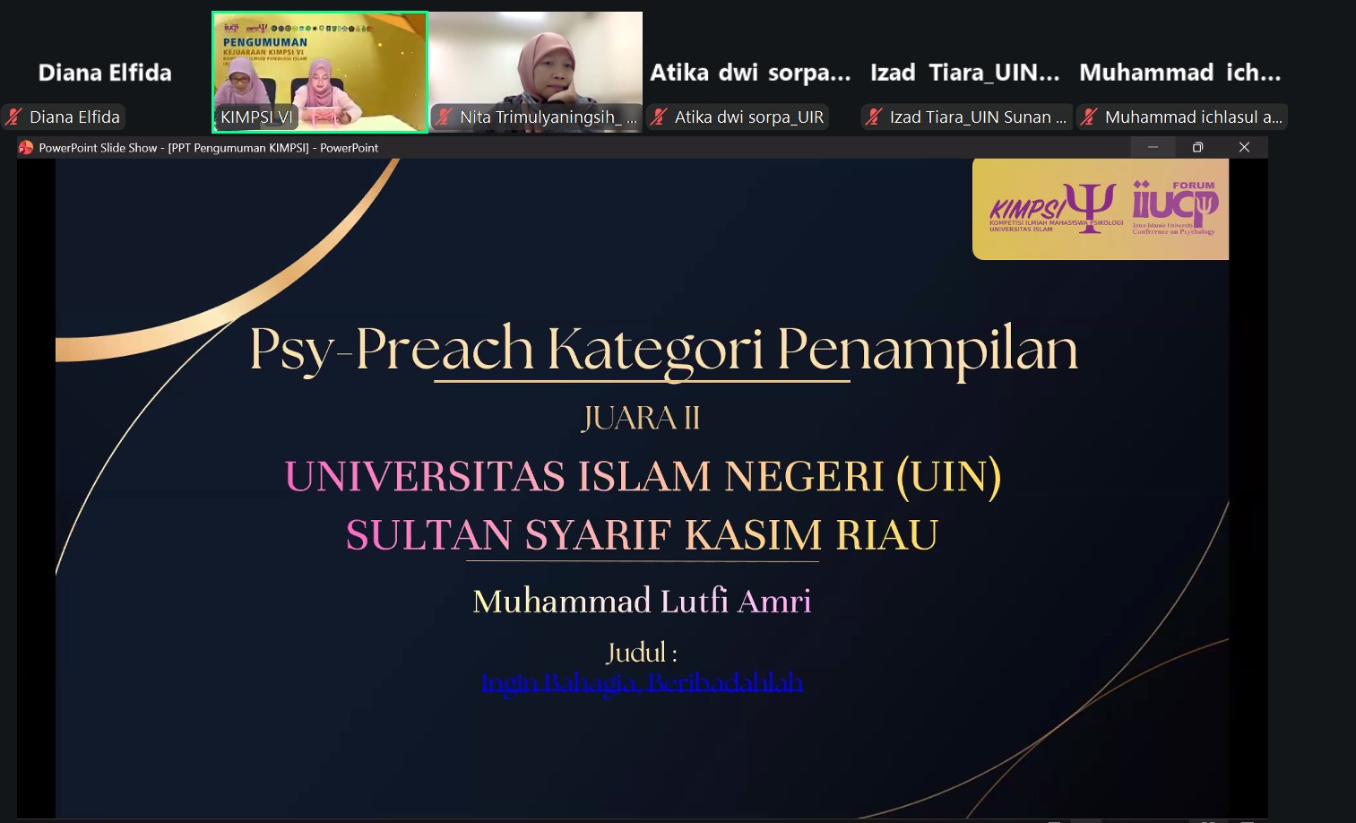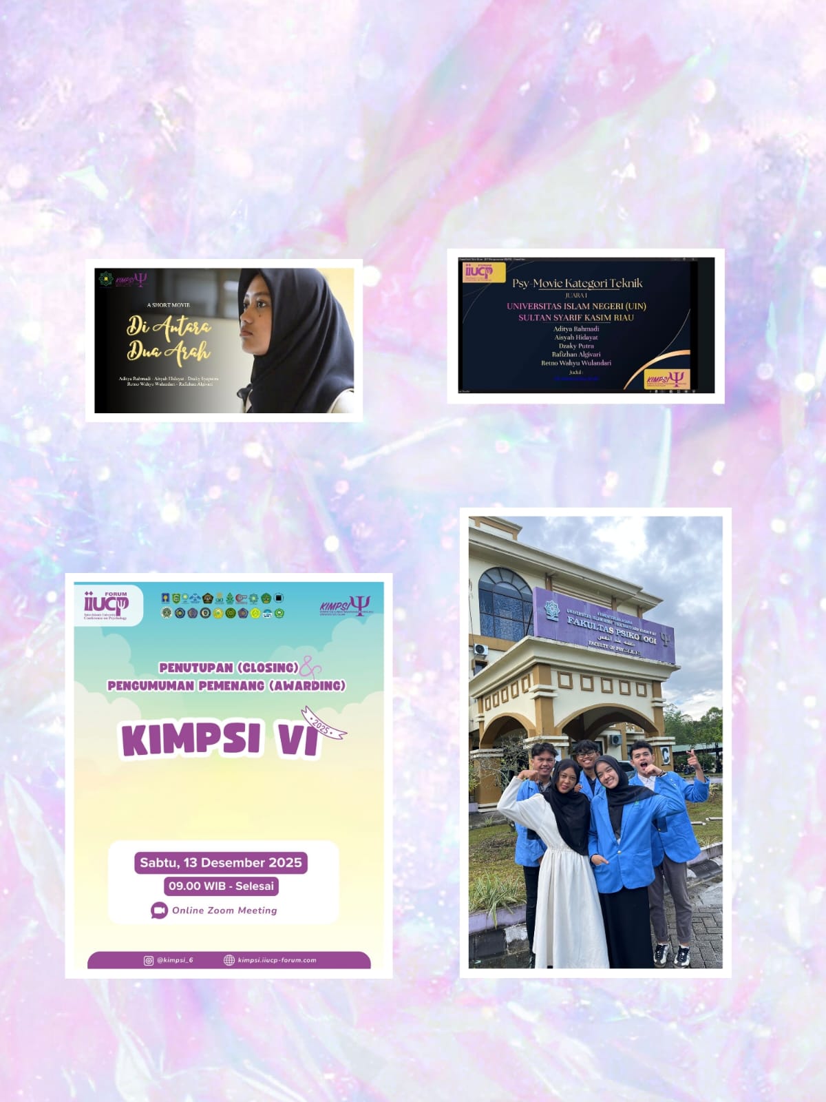 Pekanbaru, 18/12/25.  Mahasiswa Fakultas Psikologi UIN Suska Riau menorehkan prestasi yang membanggakan atas diraihnya juara-juara dalam ajang lomba KIMPSI VI 2025 ( Kompetisi Ilmiah Mahasiswa Psikologi ) di umumkan tanggal 13 Desember 2025