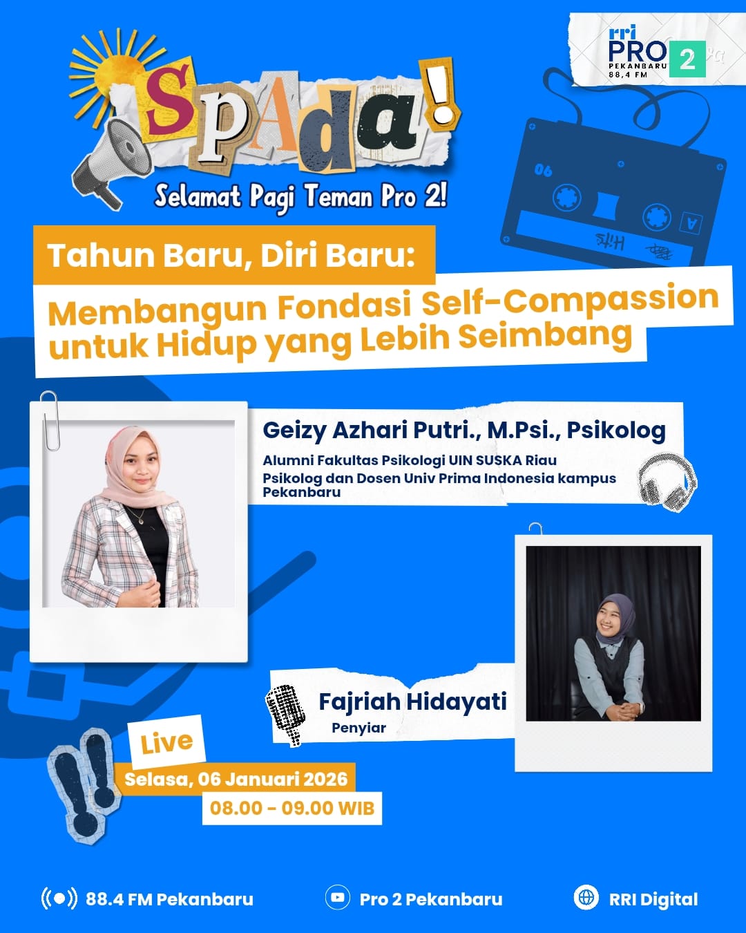 Diskusi ini disiarkan langsung pada Youtube Pro 2 Pekanbaru pada Hari, Selasa 07 Januari 2026 dengan Tema “ Tahun Baru, Diri Baru : Membangun Fondasi Self Compassion untuk Hidup yang Lebih Seimbang” dipandu oleh Fajriah dari RRI Pro 2 Pekanbaru