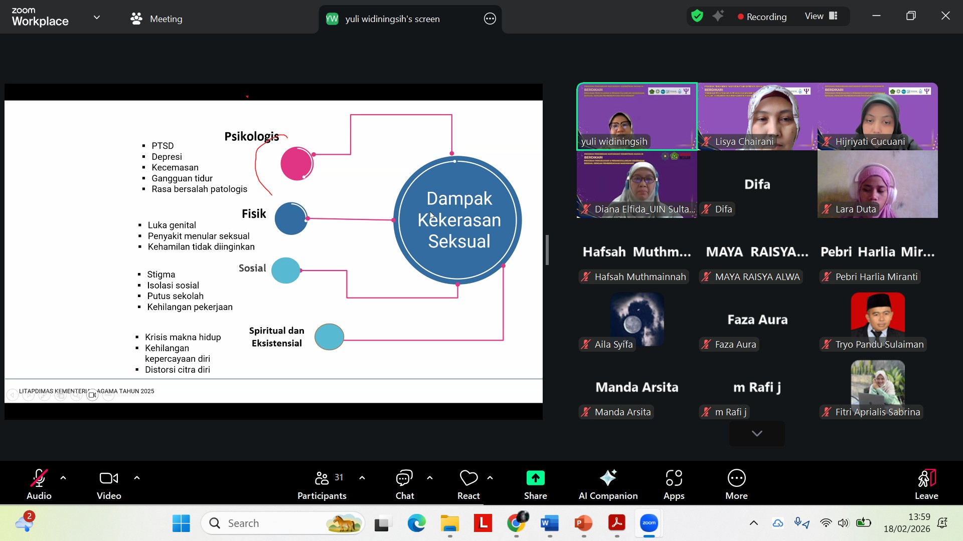 Dalam pelaksanaannya, kegiatan ini melibatkan berbagai kalangan, mulai dari mahasiswa S1, mahasiswa S2, hingga praktisi profesional. Salah satu peserta yang turut hadir adalah Fitri Aprialis Sabhrina, M.Psi., Psikolog dari Pusat Perlindungan Perempuan dan Anak (PPA) Kota Dumai, yang memberikan perspektif praktis terkait penanganan kasus di lapangan.